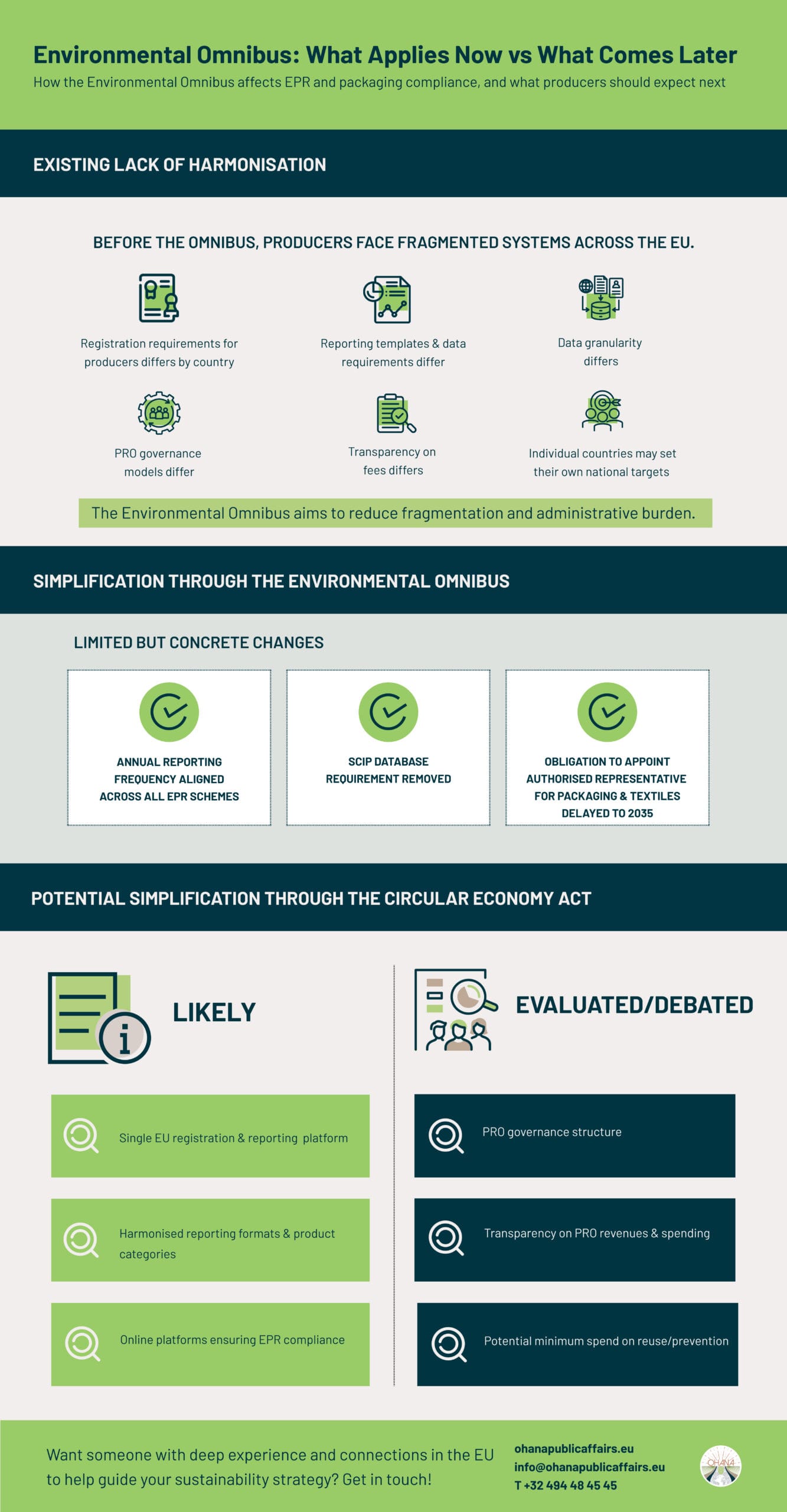 Against this backdrop, the Environmental Omnibus, published in December 2025, was positioned as a first step towards simplification of Extended Producer Responsibility rules: a way to streamline and reduce administrative burden for companies placing products on the EU market while preserving, not weakening, the core obligations placed on producers to ensure sustainable waste management.